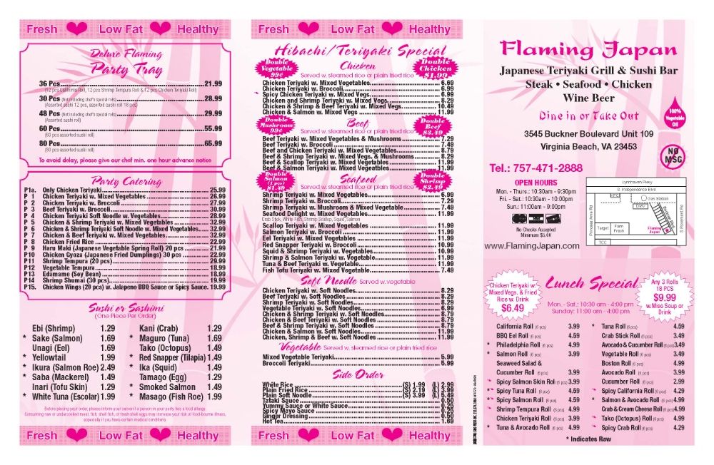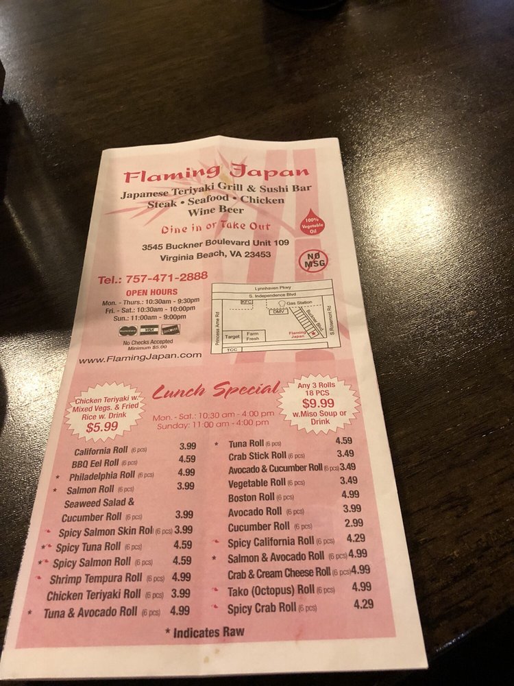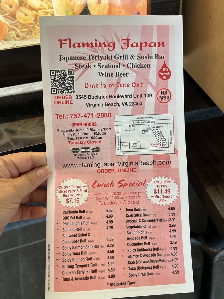 Welcome to Flaming Japan, your go-to destination for authentic Japanese cuisine in Virginia Beach. This quaint restaurant offers a delightful mix of sushi, teriyaki, and vegetarian options, perfect for casual lunches or family dinners. Guests rave about the freshness of the sushi, with standout items like the Spicy Tuna Roll and California Roll, all priced very reasonably.